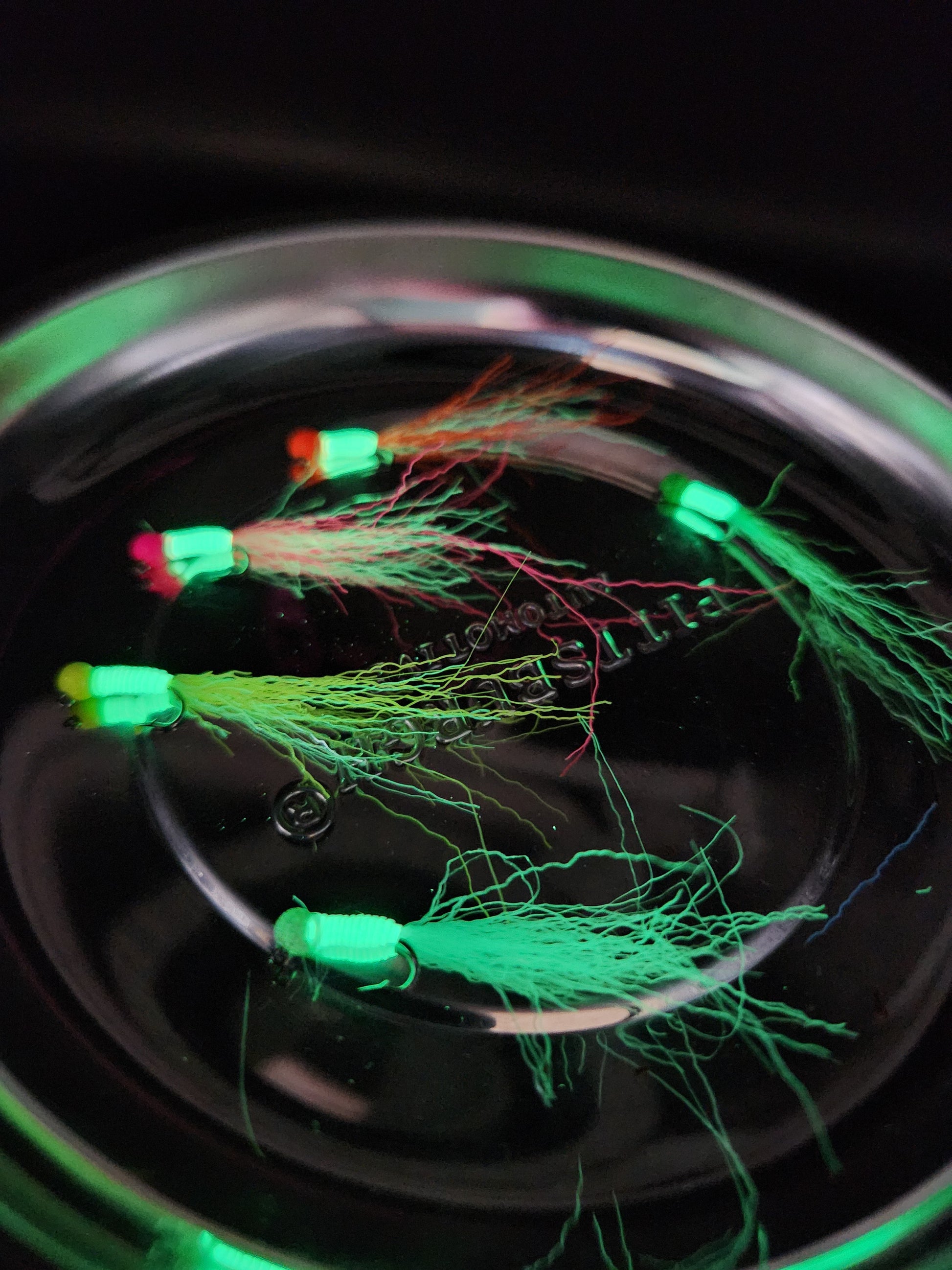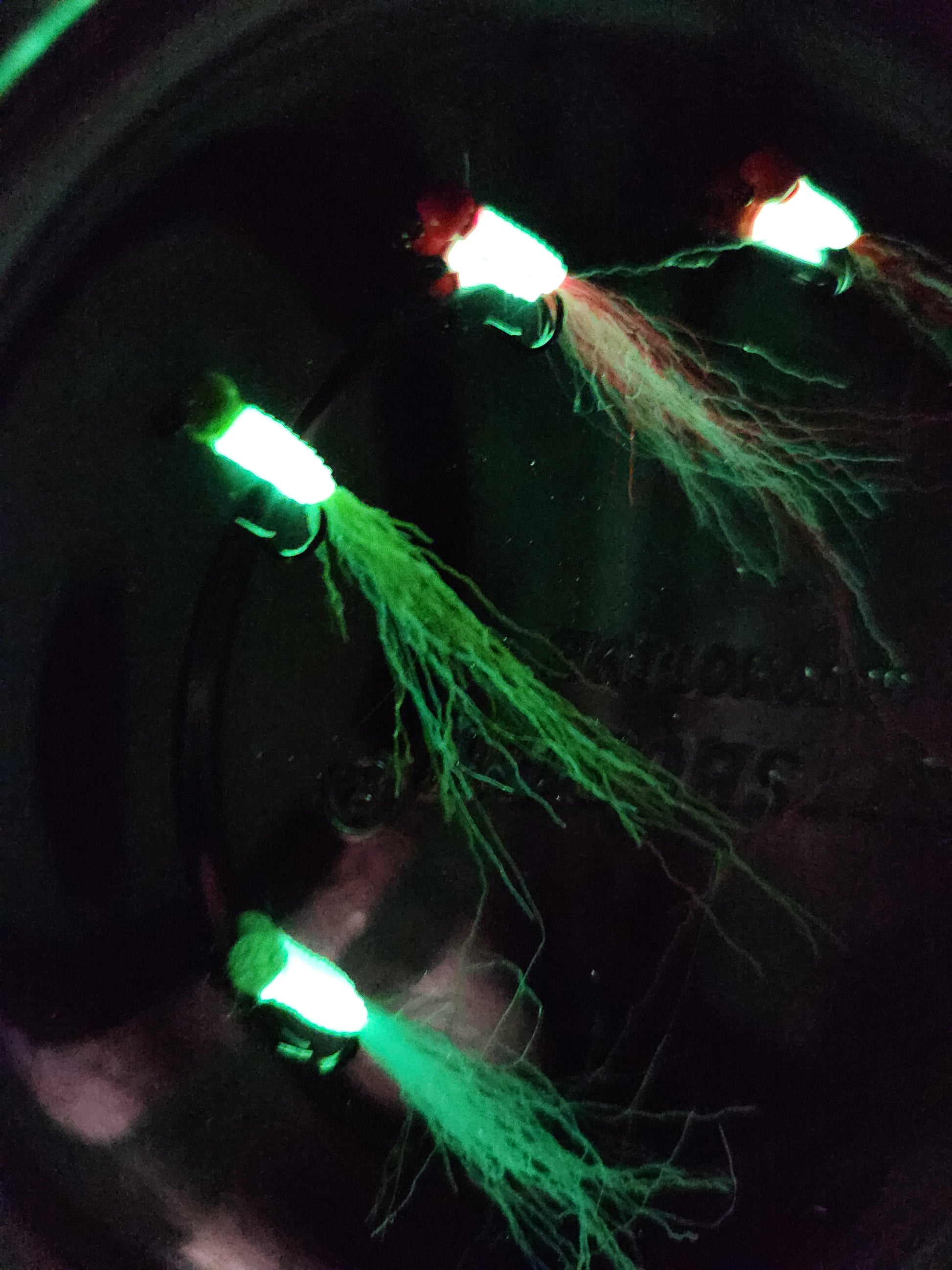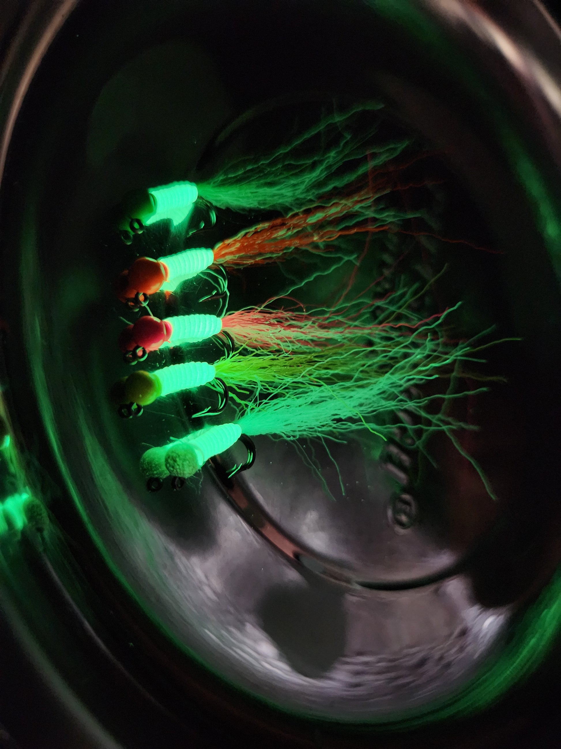 Color match head, thread, and tail. Glow body with glow tied into the tail. These look amazing in the water with or without the glow.