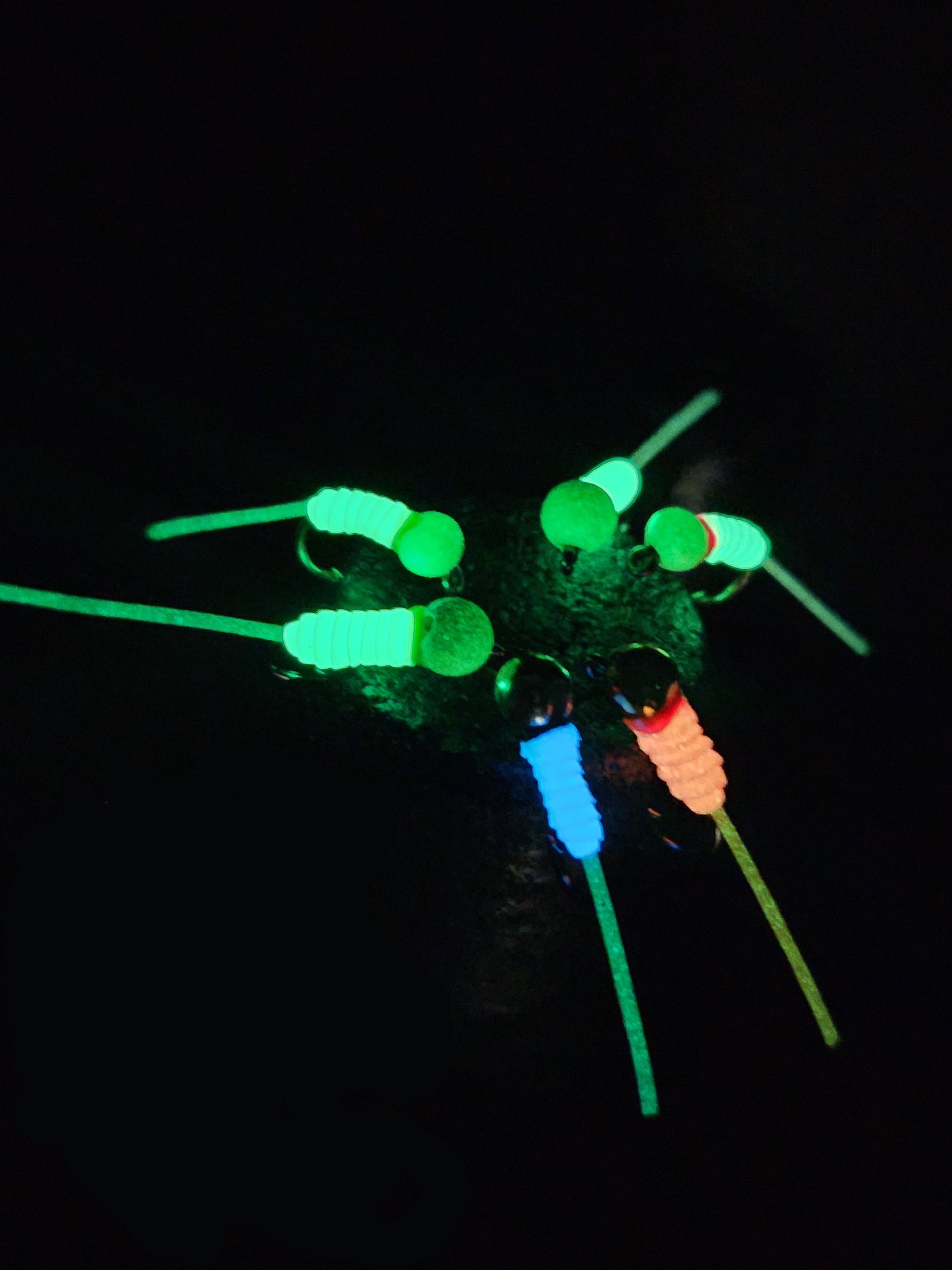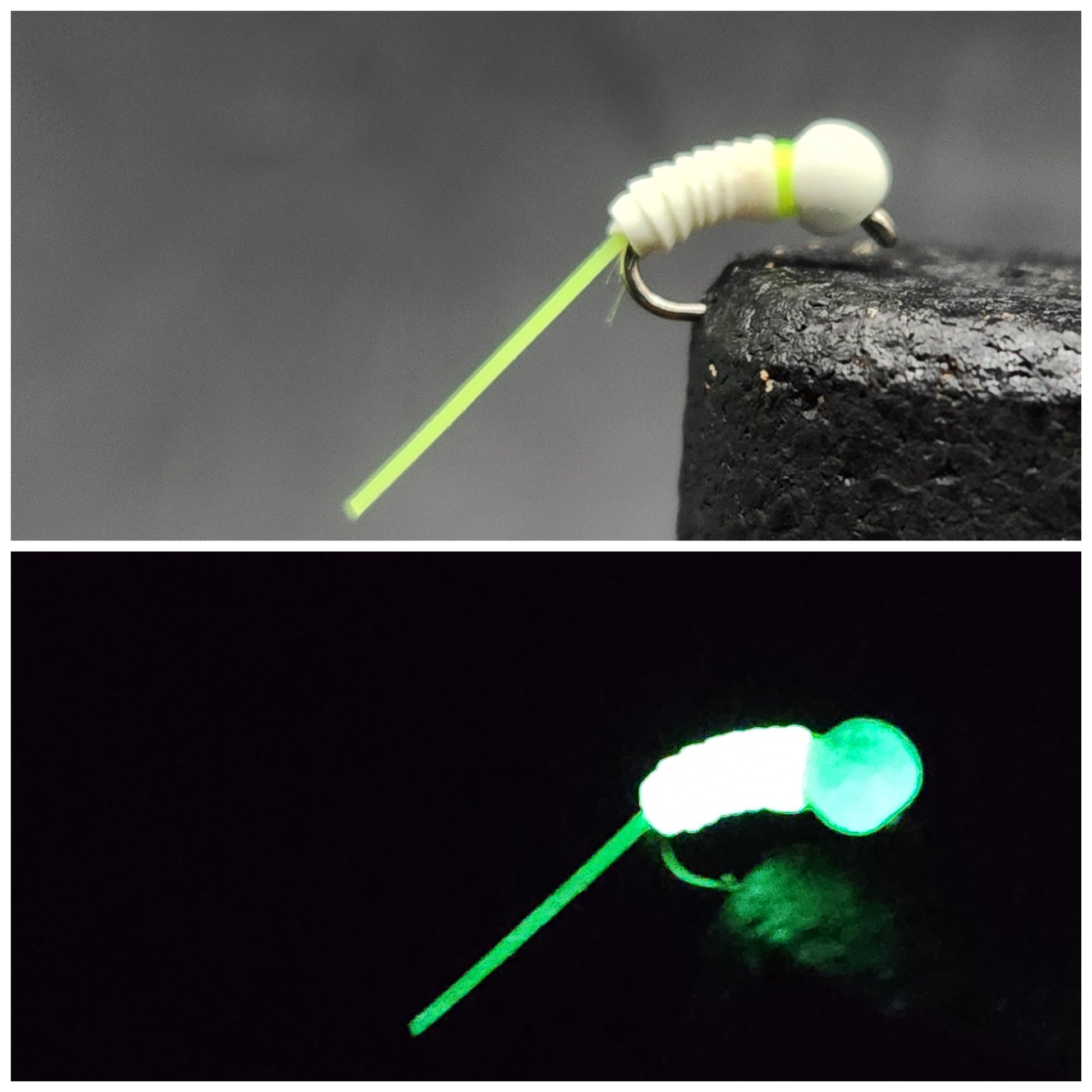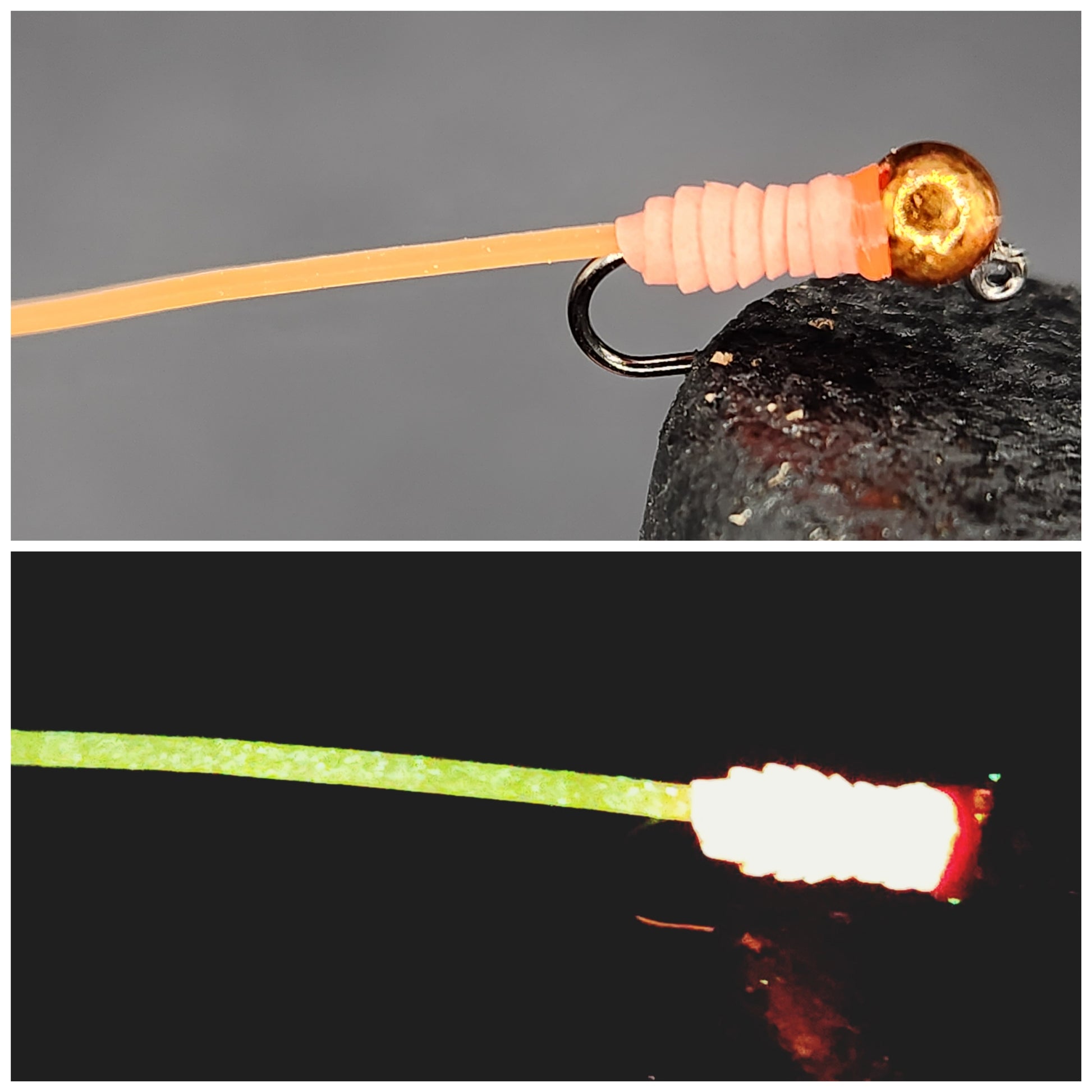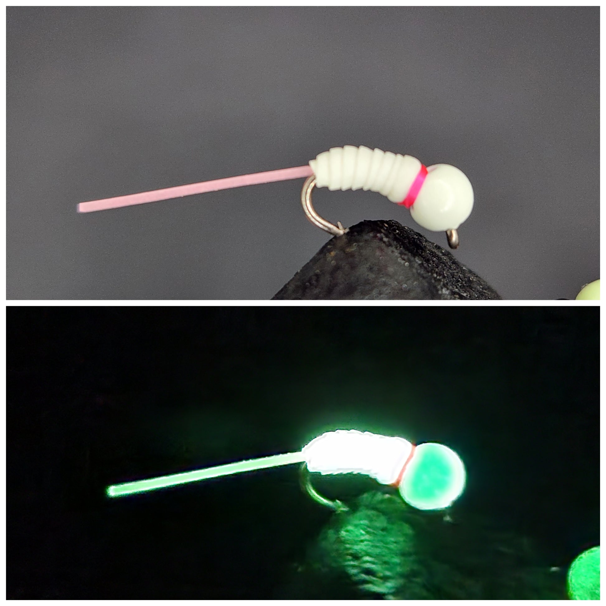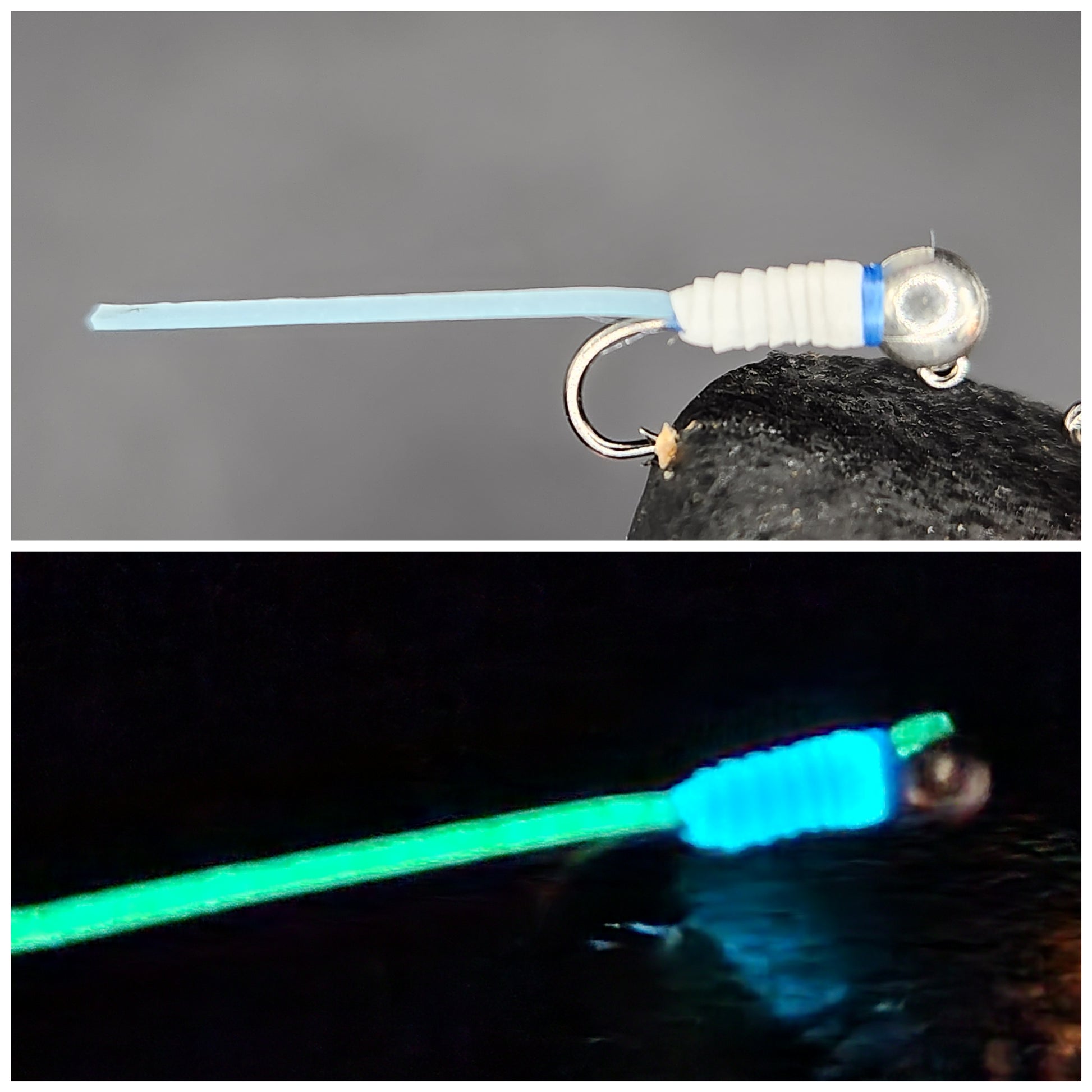 Glow Mousie is exactly what you think designed to look like a live bait mousie. BUT when hit with a light source everything glows but the thread.